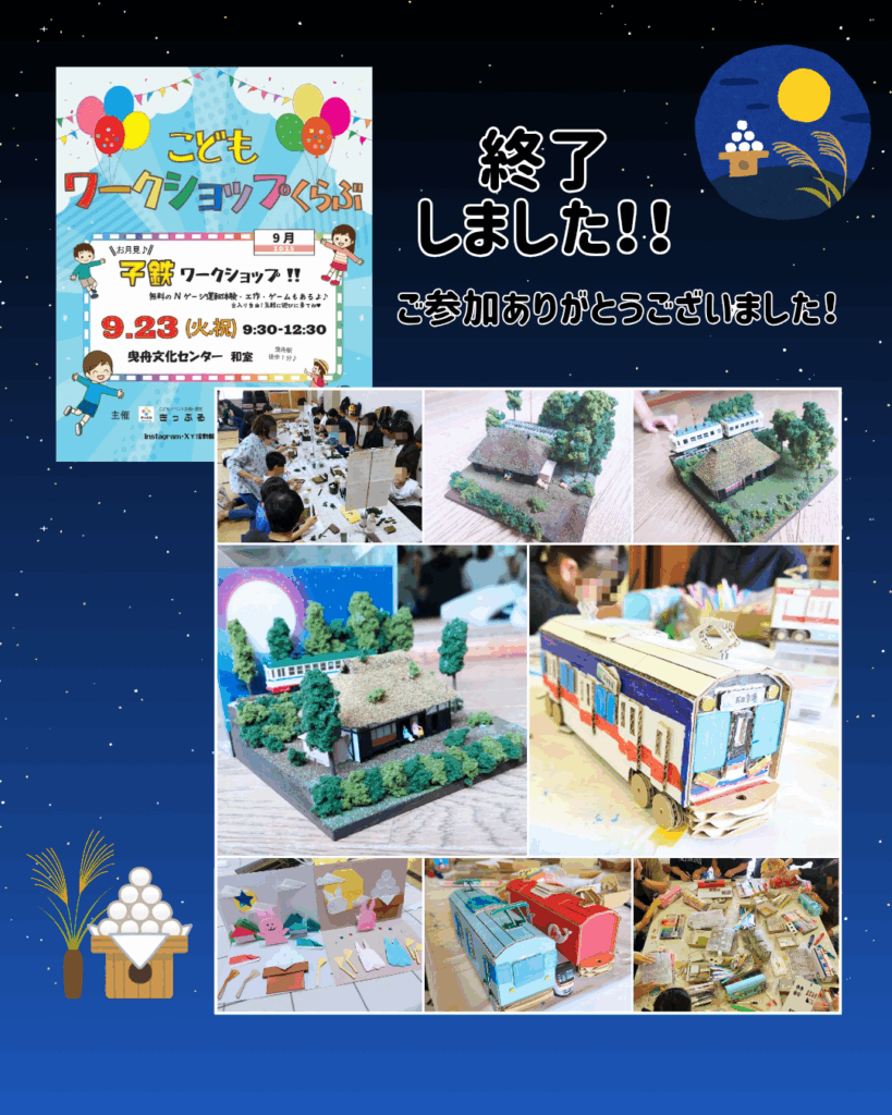 ダンボールで組み立てられた電車を土台にして、ドアや窓、パングラフ等の様々なパーツを思い思いに張り付けて自分だけのオリジナル電車を作ります。